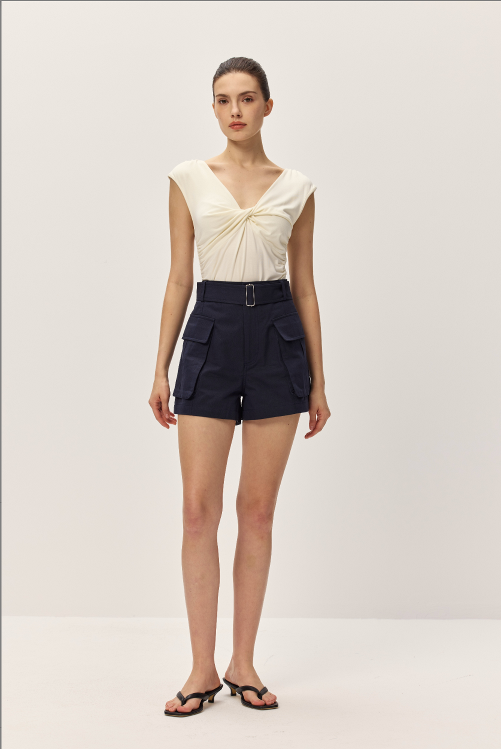 The ELODIE Aeris Shorts deliver classic cargo style with modern comfort. Featuring functional front flap pockets perfect for everyday carry, a high-rise cut for flattering coverage, and an included belt for a customized fit. Crafted in navy, these versatile shorts transition seamlessly from casual outings to weekend adventures.