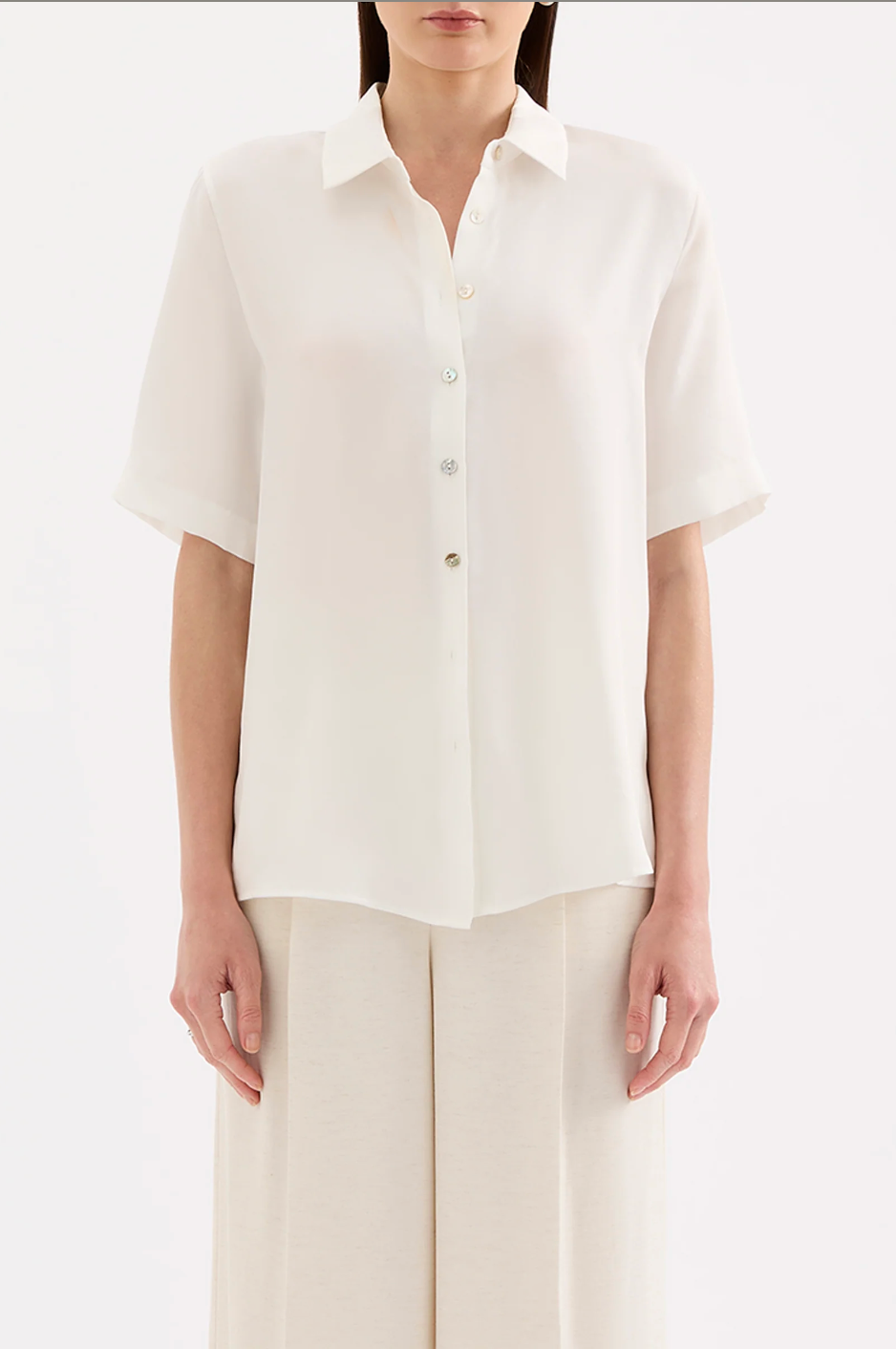 The Beckett Shirt is made with a viscose blend fabrication. This slightly sheer oversized shirt is lightweight with a smooth hand feel and features a traditional shirt collar, front button opening and shell buttons.