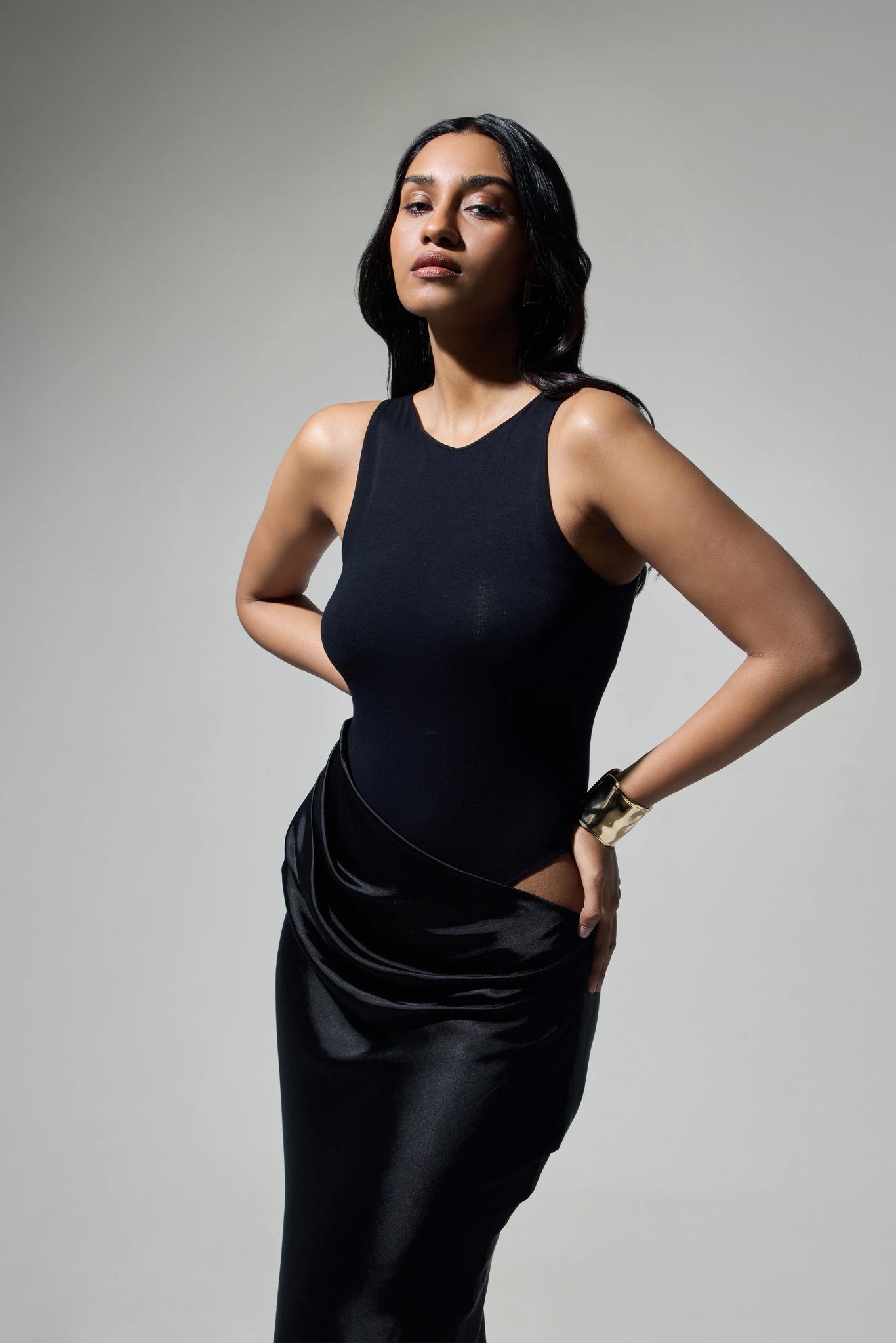 1) A versatile unlined bodysuit designed for modern movement. The high neckline and racerback cut provide confident support, while snap buttons offer easy on-and-off convenience.