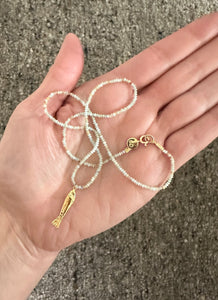 A delicate beaded Brazilian Amazonite necklace in the palest aqua hue, accented with a 18K heavy gold plated fish.