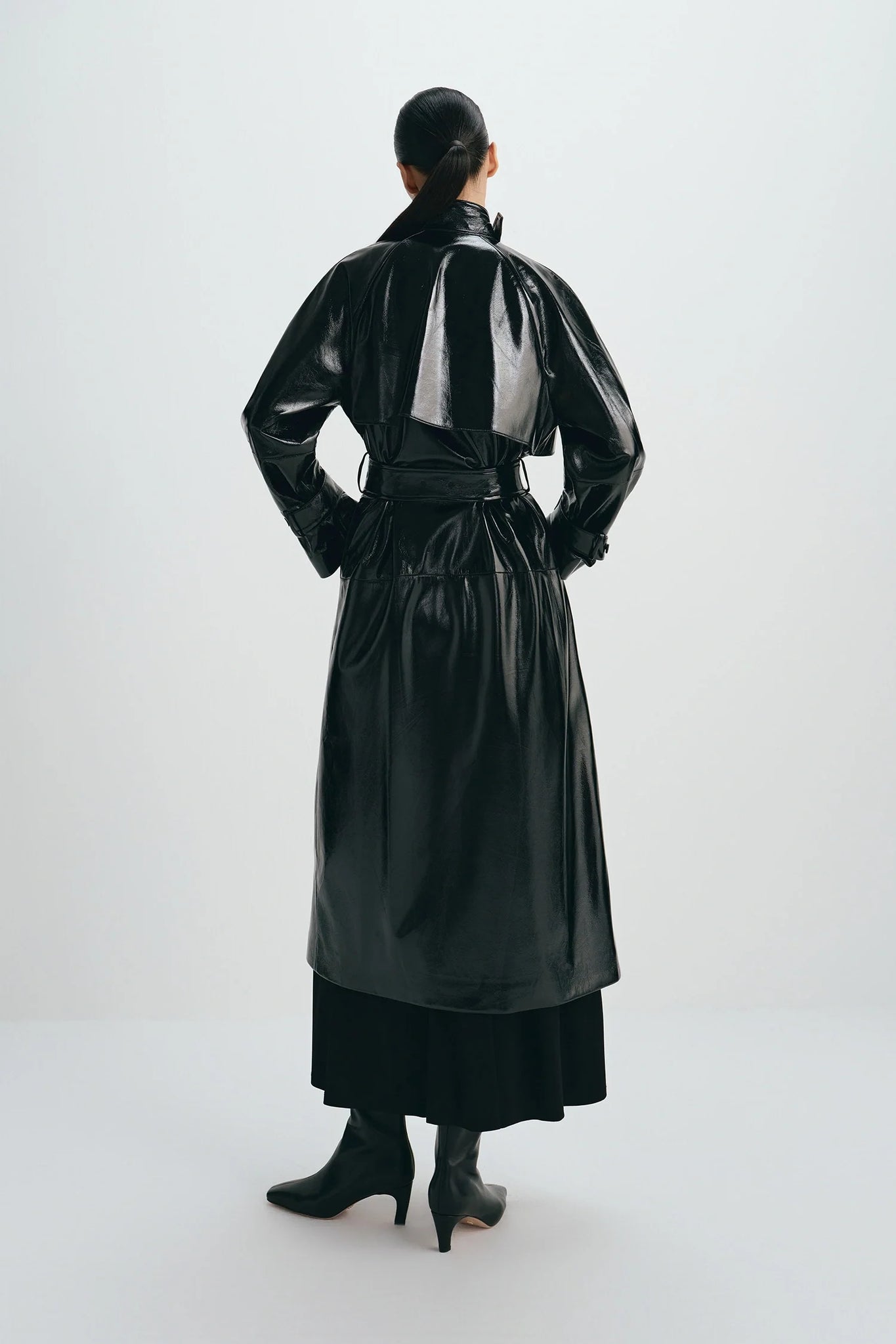 A glossy PU trench with clean tailoring and modern shine, delivering bold structure and elevated edge for contemporary dressing.