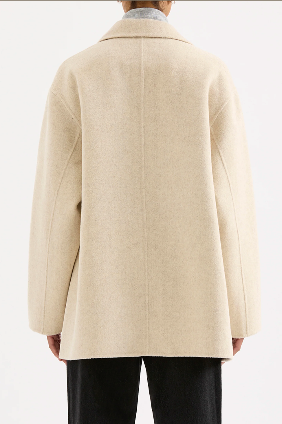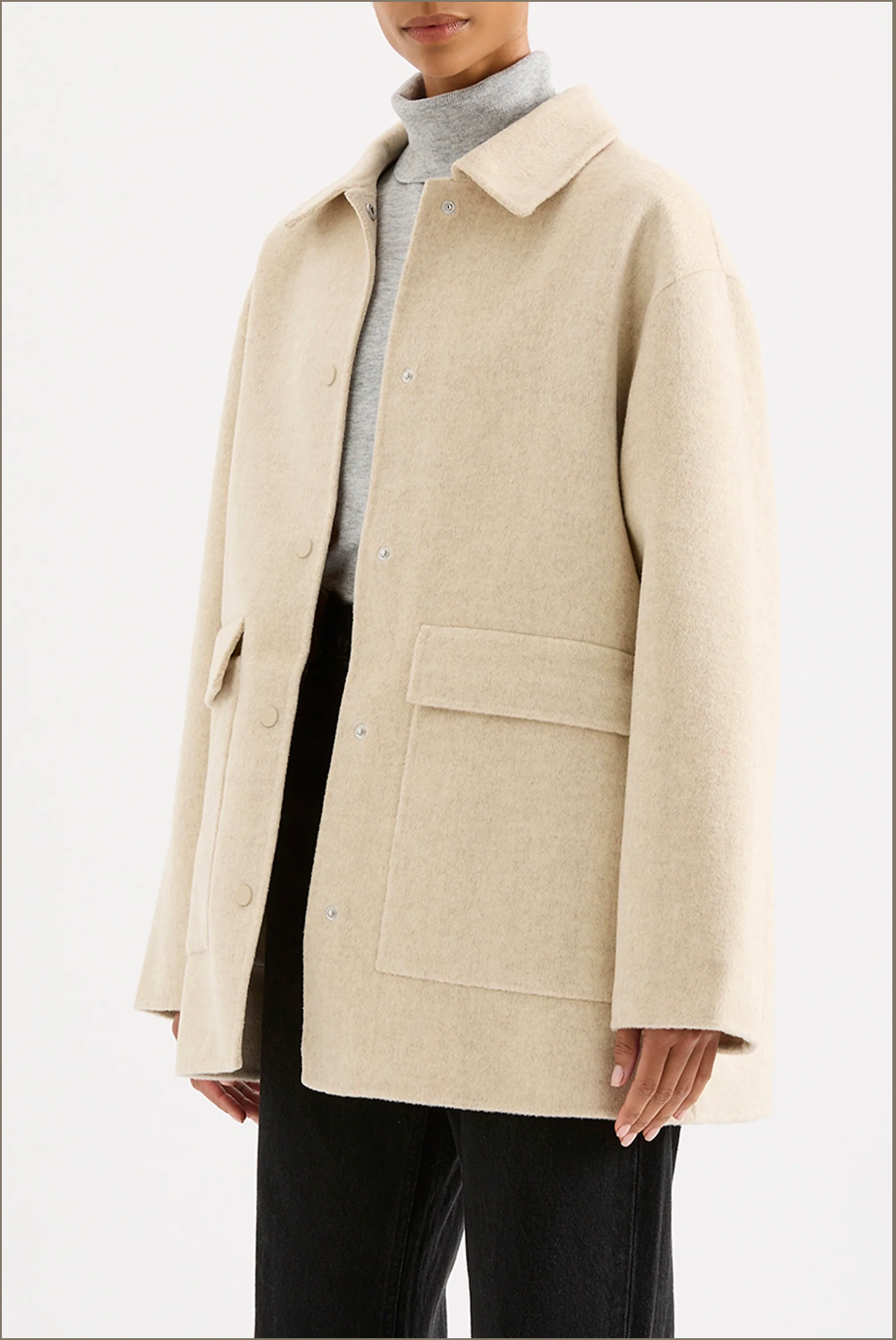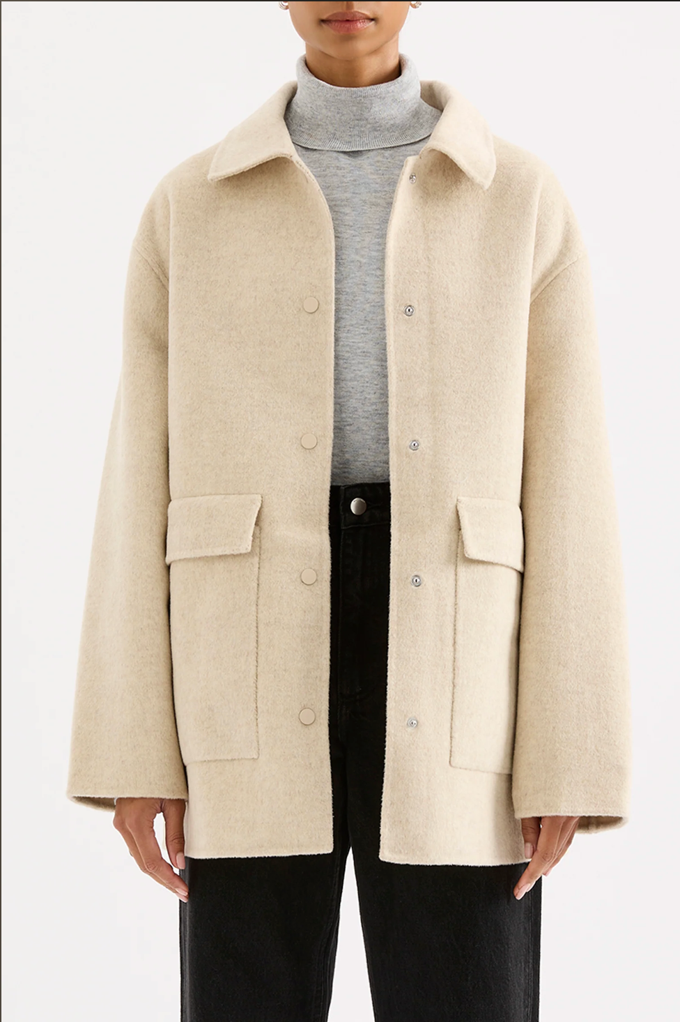 The Levi Wool Coat is made from a classic thick wool blend fabrication which has a soft, warm hand feel. The silhouette is relaxed with a dropped shoulder and length finishing below the hips. Features include front patch pockets and metal snap opening.